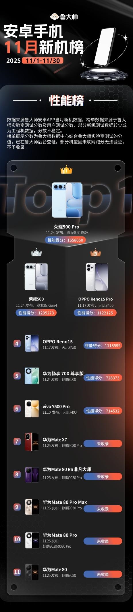 性能榜:本月唯一8 Elite,荣耀500 Pro登顶