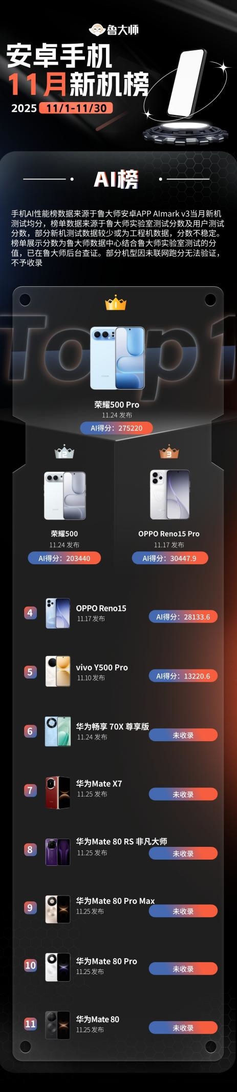 11月,荣耀500 Pro凭借均衡的配置和优化在性能、AI榜表现出色;OPPO Reno15系列则依靠ColorOS的深度优化在流畅榜上独占鳌头;华为新Mate上市带来了更多变数,尤其是麒麟芯片的AI能力令人期待。