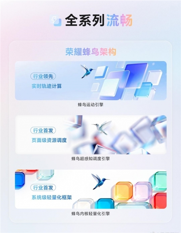 针对流畅,MagicOS 10首发了“荣耀蜂鸟架构”,其中蜂鸟运动引擎就可根据操作的力度与方向,实时生成专属轨迹,大幅提升操作直觉性与跟手感;而蜂鸟超感知调度引擎,则能动态将系统资源集中调度至关键页面,极大提升响应速度。