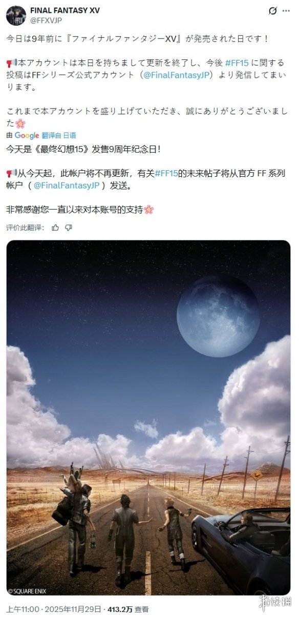 Square Enix 正式对外公布,在举办完《 最终幻想15 》发行九周年的庆祝活动后,其官方社交账号将会停止运营。往后,所有与这款游戏相关的内容,都会统一在 @FinalFantasyJP 这个账号下进行发布。
