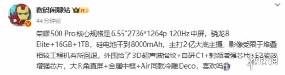 在硬件配置上,荣耀500 Pro配备一块6.55英寸的120Hz刷新率中置打孔屏,分辨率达到2736×1264。性能方面搭载骁龙8 Elite处理器,并提供最高16GB运行内存与1TB存储空间的版本。电池容量为8000mAh,采用硅基材料技术,提升续航能力。