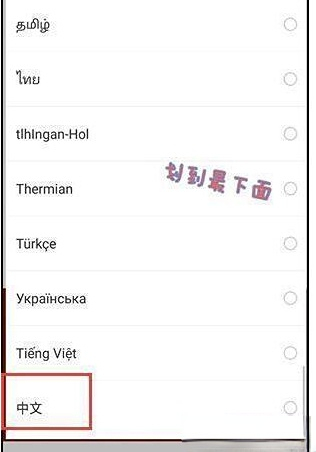 第三步:到达语言设置界面之后,往下滑找到“中文”点击就能设置,点击确定之后语言就经过了翻译。