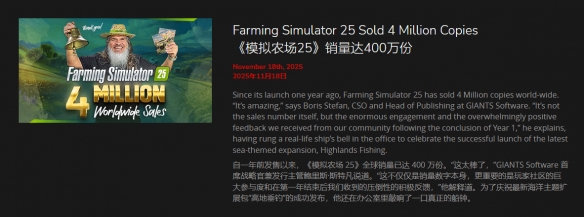 近日,开发商Giants Software宣布,种田类模拟游戏《模拟农场25》全球销量已突破400万份!