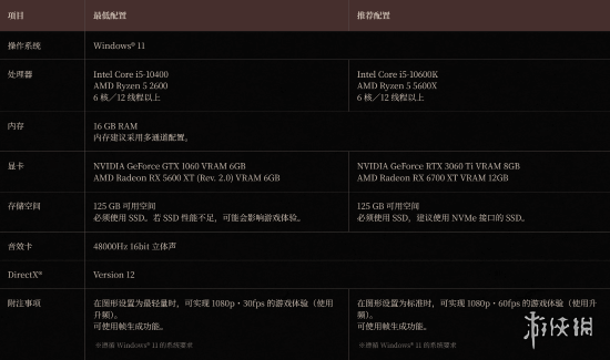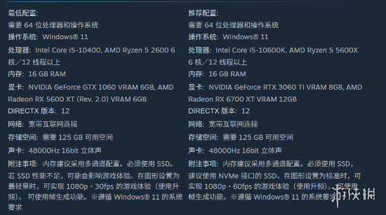 最低配置要求为RTX 1060(6G)显卡,可在1080P/低画质设定下以30帧运行游戏。若希望以1080P/中等画质达到60帧体验,则推荐配置需RTX 3060 Ti(8G)或更高性能的显卡。游戏所需存储空间为125G,可见其内容容量较为庞大。