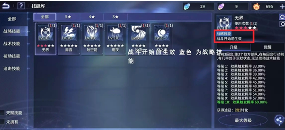 战略技能:战斗开始前生效、全局生效、多为控制、减益、角色死亡依旧有效