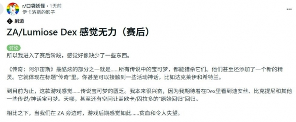 在Reddit论坛的宝可梦版块中,有玩家发帖指出,与《宝可梦传说:阿尔宙斯》相比,《Z-A》的终盘内容显得单薄,图鉴中传说宝可梦的数量明显偏少。发帖者表示,原本期待能在本作中见到蒂安希、比克提尼等幻兽,甚至期待盖欧卡、固拉多等传说宝可梦的原始回归形态,但实际游戏中仅收录了卡洛斯地区的三只传说宝可梦。更令玩家困惑的是,作为一部以“重启Mega进化”为宣传重点的作品,《Z-A》却未收录任何拥有超级进化形态的传说宝可梦,例如拉帝欧斯、拉帝亚斯、超梦和烈空坐。