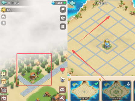 初始地位于地图的最下方,首先就是砍仙人掌,解锁迷雾,点击海岛宝箱,获取生命之水,然后升级生命之泉。