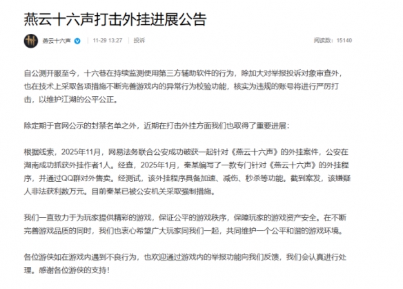 《燕云十六声》官方日前发布公告,宣布成功破获一起针对该游戏的外挂案件。网易法务部门与公安机关协同行动,于2025年11月在湖南抓获外挂作者秦某。经调查,该嫌疑人从今年1月起编写具备加速、减伤、秒杀等功能的第三方程序,并通过QQ群进行售卖,截至案发已非法获利数万元。
