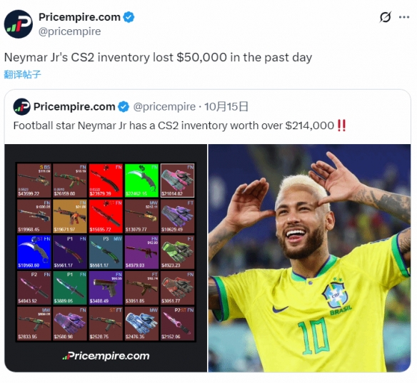 此外,PriceEmpire透露,巴西球星内马尔个人的《CS2》饰品库存在过去24小时内缩水约5万美元,看来就连名人也没能幸免。