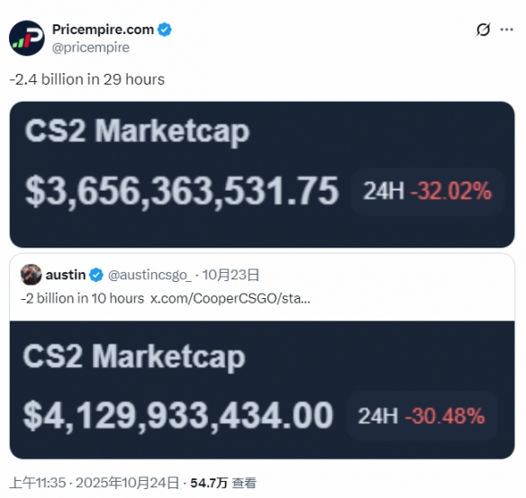 根据PriceEmpire的数据,过去29小时内,《CS2》饰品市场的总市值从约60.6亿美元暴跌至36.5亿美元,短短一天多的时间里便蒸发了约24亿美元(约合人民币170.9亿元),跌幅最高一度达到39.6%。