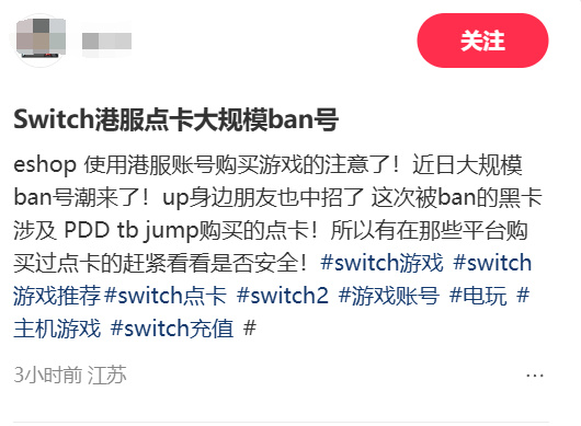 近日,多个社交平台上有玩家反映,其港服任天堂账号遭到封禁。据了解,多数受影响用户曾通过第三方平台购买港服点卡进行充值。