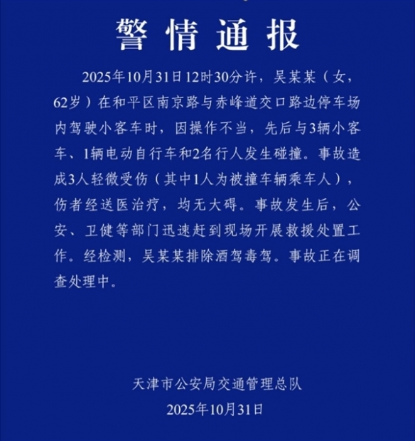 根据官方通报,驾驶人吴某某为62岁女性。经检测,已排除其酒驾、毒驾嫌疑,事故直接原因为操作不当。本次事故共造成4车(含一辆电动自行车)受损,3人受轻微伤(其中一人为出租车乘客)。伤者经送医治疗后,均无大碍。