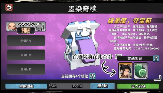 1、首次通关墨染奇椟任意层数后,可获得首通奖励。