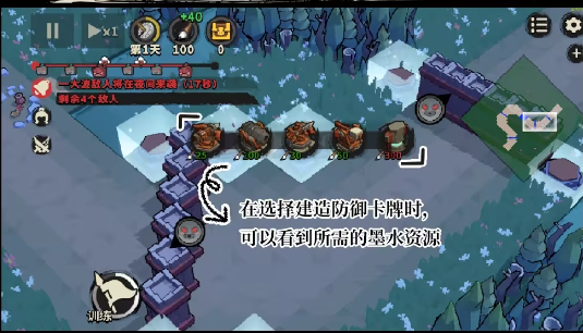 2、在高难度下,前期墨水紧缺,可以使用低费防御卡牌进行防御来追求性价比,积攒资源在关键位置放置墨灵塔等强力防御卡牌,击败来犯的敌人。