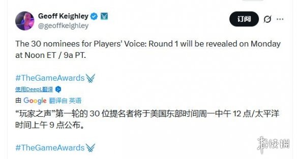 TGA主持人Geoff Keighley通过推特宣布,#2025TGA#“玩家之声”奖项的30款提名游戏将于北京时间12月2日凌晨1点正式揭晓。届时将有哪些作品获得提名,引发玩家广泛猜测。