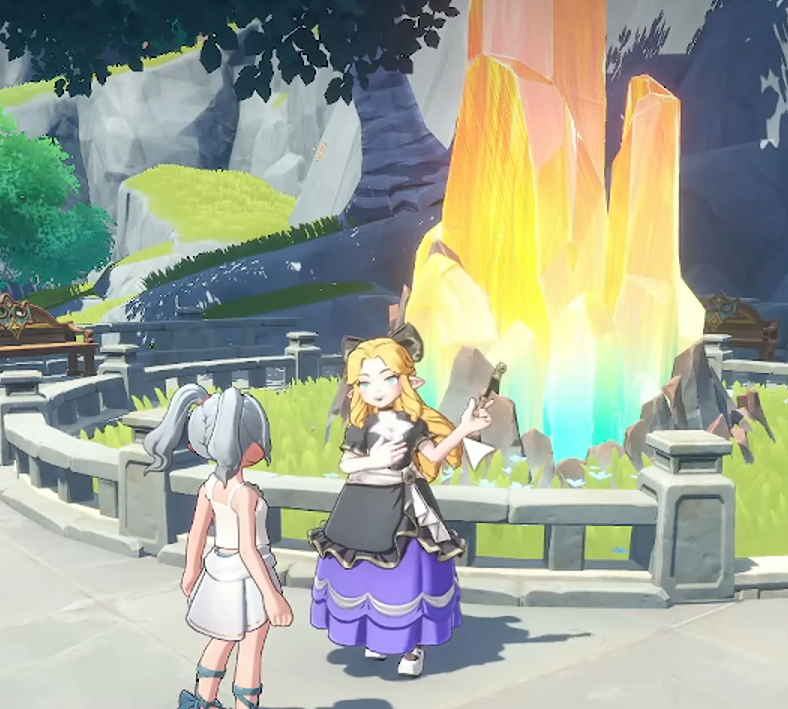 想要参与精灵寻宝任务,首先需要前往地图中的采邑地。该区域中心位置设有一块醒目的彩色巨矿,十分容易辨认。在矿石附近,会有一位金色头发的女性NPC驻守。与其对话即可开启“精灵寻宝”活动流程,任务入口清晰明了,操作简单便捷。