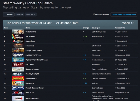 Steam最新一周(10月14日-10月21日)游戏销量榜正式揭晓。《战地6》势头不减,成功蝉联冠军,实现三连冠。第三人称撤离射击游戏《Arc Raiders》紧随其后位列第二,近期热度颇高的国产PVE搜打撤游戏《 逃离鸭科夫 (Escape From Duckov)》则冲至第四名,表现亮眼。