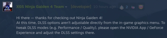 媒体指出,《忍者龙剑传4》提供了有限的画质设置选项,涵盖了贴图、阴影、环境光遮蔽、反射和体积雾效果,并允许开启或关闭风效和动态模糊。同时,游戏支持NVIDIA DLSS和AMD FSR,但不支持Frame Generation帧生成。此外,DLSS的画质调整只能在NVIDIA软件外部进行,而不能在游戏内直接调整,这一点稍显遗憾。