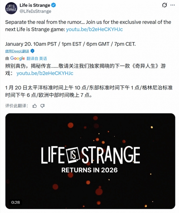 《奇异人生》系列新作《Life is Strange: Reunion》(奇异人生:重聚)已于近日通过评级信息提前曝光,随后官方也正式宣布了该作的存在,并计划于北京时间1月21日凌晨2点公布更多详情