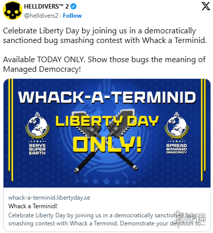 《绝地潜兵2》年度"自由日"庆典现已启动,玩家仅剩数小时可体验"打地鼠式"限时小游戏"重击虫族"。若全体玩家使用R-2124"宪法"礼仪步枪累计消灭4000万敌人,还可领取专属自由日披风。