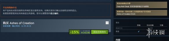 由Intrepid Studios使用虚幻5引擎开发的MMORPG《 创世灰烬 》,已于12月12日以“抢先体验”模式正式登陆Steam。游戏国区原价168元,首发享15%折扣,折后价142.8元。然而,游戏在上线时明确标注不支持中文。