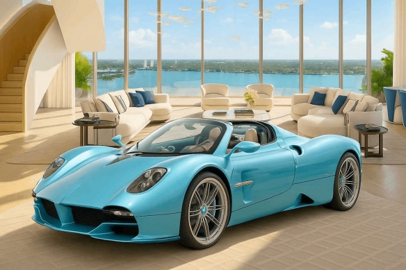 该 Utopia Roadster 车型由品牌创始人 Horacio Pagani 亲自参与设计,采用专属蓝色涂装,最高时速可达217英里/小时(约349公里/小时)。全球仅限量生产130辆,因此购买该顶层公寓也被视为“跳过排队”、直接拥有这款稀有超跑的绝佳途径。