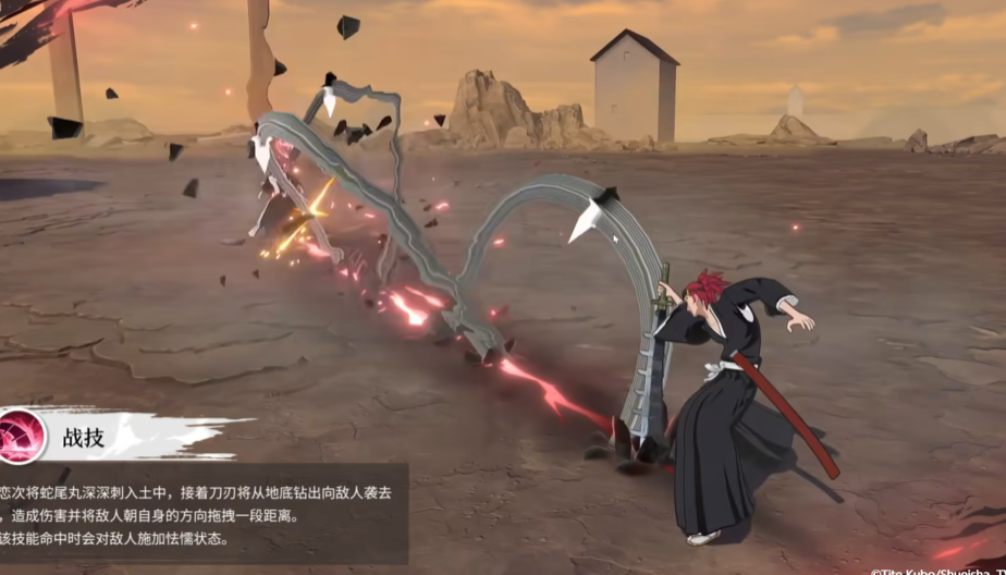 恋次降蛇尾丸深深的刺入土中,接着刺入土中的刀刃将会直接从地底下钻出来并且朝着敌人袭击,造成伤害的同时还能将敌人朝着自身的方向给拖拽一段距离,该技能一旦命中对手也能附加上怯懦的状态。