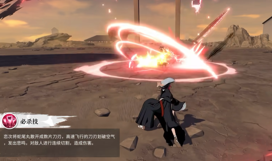 恋次的必杀技能可以直接让武器化身成为无数片刀刃,朝着敌人的方向快速的攻击,刀刃高速飞行时划破空气会发出悲鸣,一旦刀刃命中对手就会开始对敌人进行连续的切割,给敌人造成致命的伤害。