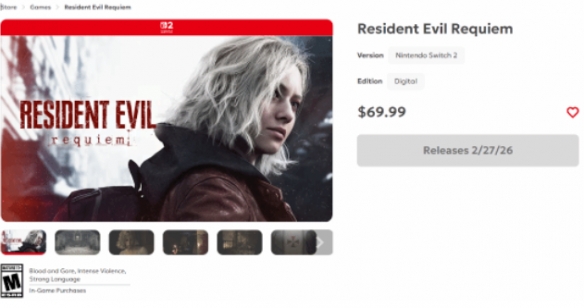根据任天堂官方商店信息,《生化危机9:安魂曲》NS2版本售价69.99美元,需29.3GB存储空间,评级为M级(17+),实体版预购价59.99英镑较其他平台低10英镑。《生化危机9:安魂曲》定于2026年2月27日登陆PS5、Xbox Series X|S、Switch 2及Steam平台。