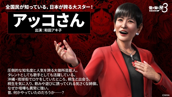 SEGA在日前播出的《人中之龙》系列官方节目「人中之龙工作室 TV」第 44 集「《人中之龙4:继承传说者》开发幕后故事&20 週年新企划启动发表!」中,公开了由日本老牌歌手和田现子(和田アキ子)客串演出的《人中之龙 极 3 / 人中之龙 3 外传 Dark Ties》登场角色「Akko(アッコ)」的画面与详细资讯。