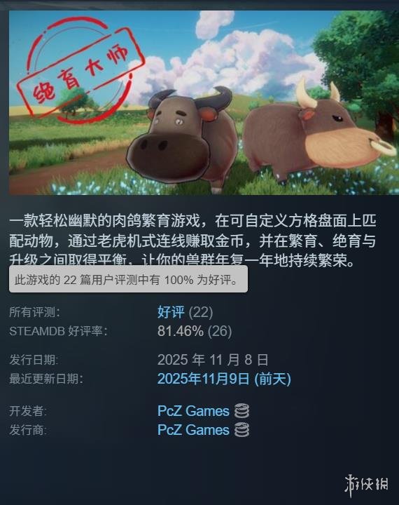 肉鸽繁育游戏《绝育大师》现已在Steam平台上线,首发优惠仅需15.40元,支持中文。截至发稿前,本作仅收录22位玩家测评,好评率100%。