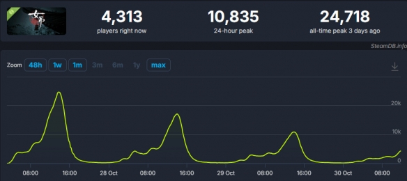 SteamDB 的统计数据直观地展现了这款 Demo 的火爆程度:其玩家在线峰值高达 24718 人,近 24 小时内的在线峰值也有 10835 人,即便在撰写稿件时,仍有 4313 名玩家同时沉浸在游戏世界中。如此亮眼的数据,让《女吊》成功跻身 Steam 尖叫节最受瞩目的新游行列。