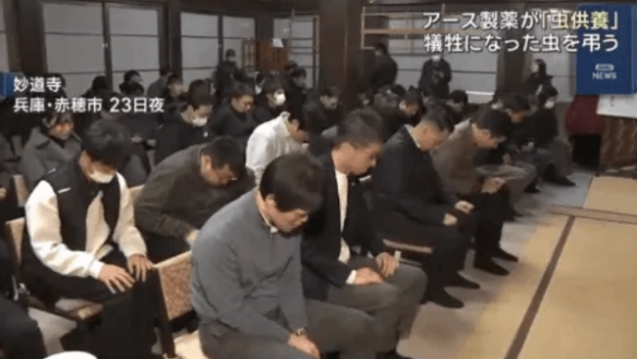 日本知名杀虫剂制造商Earth制药近日举行了一场与众不同的年度活动。在兵库县赤穗市的妙道寺内,公司约90名员工与寺庙住持一同,为在产品研发过程中“牺牲”的实验昆虫举办了一场庄严肃穆的追悼会。佛龛前整齐摆放着蚊子、蟑螂、螨虫等七种昆虫的遗像,众人诵经、上香、合十祭拜,仪式持续约一小时。