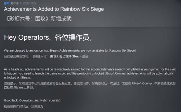 育碧在Steam的公告中表示:“我们很高兴地宣布,《彩虹六号:围攻X》现已支持Steam成就!”对于老玩家来说,不必再为解锁成就而强迫自己重新挑战,因为育碧承诺,任何在Ubisoft Connect上已解锁的成就,玩家下次登录游戏时将自动在Steam上回溯解锁。