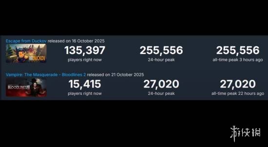 10月22日《吸血鬼:避世血族2》正式发售,评价和口碑都受到质疑,在表现上可以说完全不如一款我们的国产独立游戏。推主Pirat_Nation整理出两款游戏的Steam数据对比图,《逃离鸭科夫》几乎是《避世血族2》的9倍!