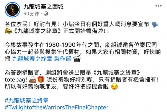 10月20日,电影官方再度发布重要消息:系列第三部《九龙城寨之终章》正式启动筹备。因剧情背景设定于1980至1990年代,剧组同步发起时代旧物征集活动,公开向社会征集与该时期相关的物件。参与者如捐赠符合要求的物资,将有机会获赠《九龙城寨之终章》主题限量帆布包作为回馈。