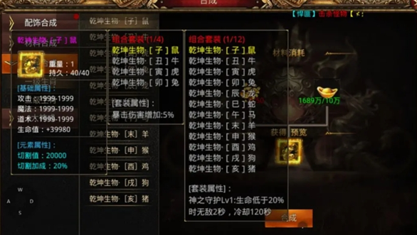 【生肖】共有12件装备(生肖不仅能提升大量基础属性、切割值外,最重要的是套装效果:生命值低于20%时无敌2秒)PK能力大幅提升;
