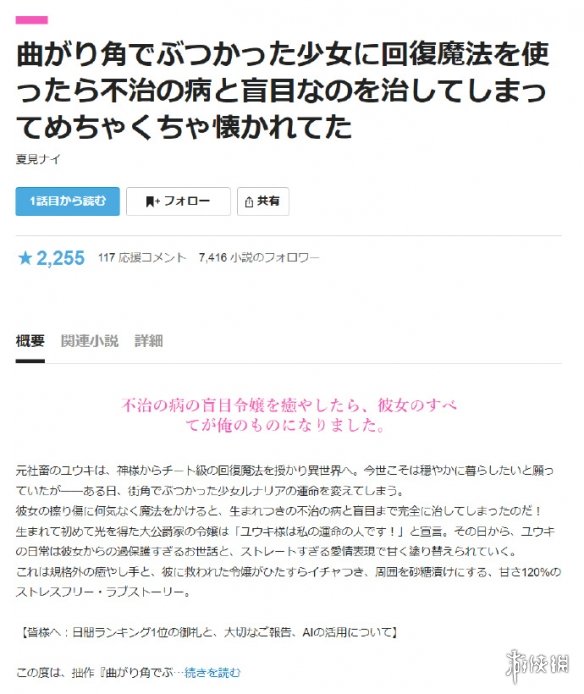 据报道,一部主要由ai进行创作的异世界冒险小说《在街角与少女相撞后使用了治愈魔法,结果把她的不治之症和失明都治好了,还被她疯狂黏上了》登顶了角川网络小说网站周排行榜。