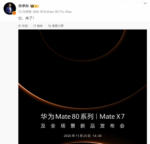 华为官方已正式宣布,将于11月25日举行华为Mate 80系列、Mate X7及全场景新品发布会。华为常务董事、终端BG董事长余承东今日通过视频首次公开了Mate 80系列的真机外观。