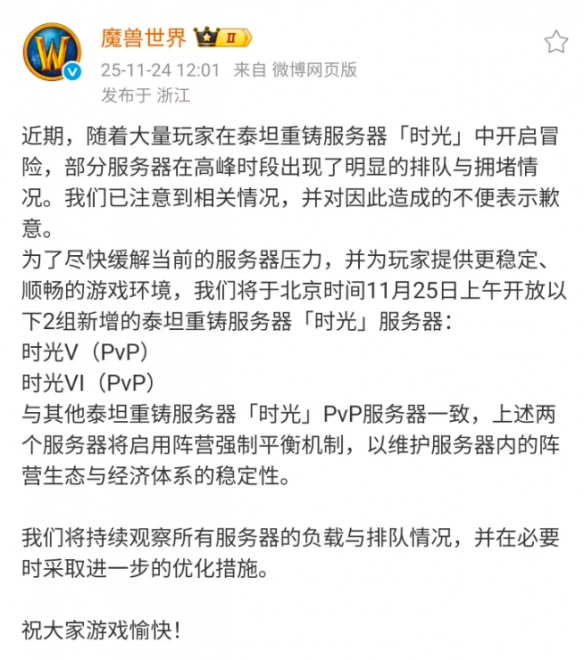 11月18日,国服《 魔兽世界 》泰坦重铸服务器「时光」正式上线,游戏上线以后非常火爆,而今天,魔兽世界官方发布声明:表示随着大量玩家在泰坦重铸服务器「时光」中开启冒险,部分服务器在高峰时段出现了明显的排队与拥堵情况。