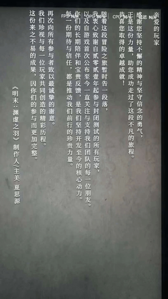 《 明末:渊虚之羽 (WUCHANG: Fallen Feathers)》1.7版本更新已正式推出,除先前公布的豪华版专属内容、重生挑战功能及免费头饰装备外,本次更新还在结尾新增了制作人夏思源致玩家的一封信。B站Up主@中年玩家张小夏在其视频评论区分享了这封信的截图,引发了玩家社区的广泛关注。