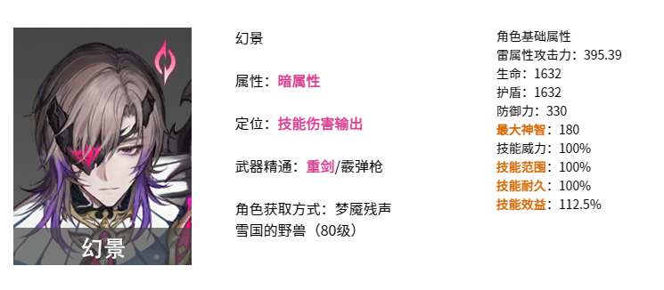幻景并不是前期就可以拿到的角色,玩家就需要通关主线第3章节,然后去挑战梦魇残声。在这一个副本中就有一个雪国野兽,在打败之后才能够解锁,而这一个阶段基本上已经进入到游戏中后期。系统会默认为你实力比较出色,而如果选择硬是提前解锁没有配套属性支撑,那体验感也会受到影响。武器选择在养成时是比较重要的,如果是近身作战,在变身时有一个专属的攻击模组,建议挑选焦渴。有18%的技能耐久加成,可以减少在变身时的神智消耗,对循环还是比较友好的。