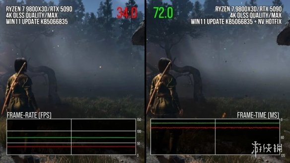 为了深入探究这一问题的真实性,数毛社开展了详细的测试工作。他们在配置为Ryzen 7 9800X3D处理器搭配RTX 5090显卡的高端电脑上进行测试。测试结果显示,游戏性能帧数出现了大幅下降,降幅范围在33%到50%之间。