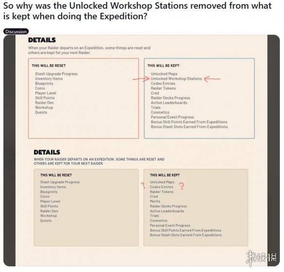 然而首个远征赛季启动后,许多玩家愤怒地发现,除初始工作台外,所有制造站都需要重新解锁并升级。实际上在远征开启前数日,游戏内的物品保留列表已悄然调整——"已解锁工作台"从"保留项目"列表中消失。虽有玩家指出工作台本就属于重置范畴,但更多参与者表示,正是因为早前列表的标注使他们误以为工作台能够延续。