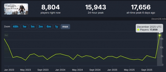 据SteamDB数据显示,《刺客信条:英灵殿》在冬促期间的同时在线玩家数达到17656人,超过了2022年创下的15679人记录。这对于一款已发售三年的游戏而言,充分展现了持久的吸引力。