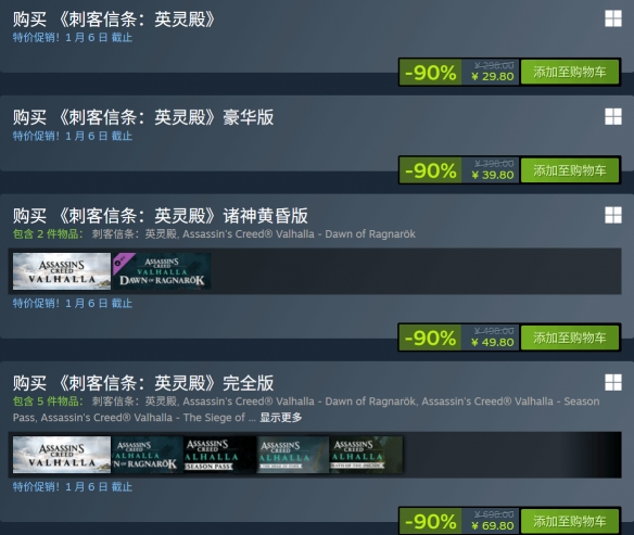 据了解,本次促销中《刺客信条:英灵殿》标准版限时1折,原价298元,现仅售29.8元。活动截止到1月6日,感兴趣的玩家快抓紧时间购买吧。