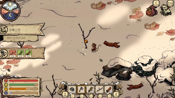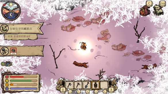 和其他硬核的死亡惩罚机制的清空背包、一切重来带来的生存焦虑不同,《林间暖巢》的低压生存则不会让你在维持各个数值之间疲于奔命。食物随处可见、体力可以瞬间恢复、战斗可以通过走位避让,唯一需要注意的是保持御寒,但就算生命值低于0触发效果也仅仅是晕倒并清空部分背包。就上次见这死亡惩罚还是在《星露谷》里面,可那是个休闲游戏啊!