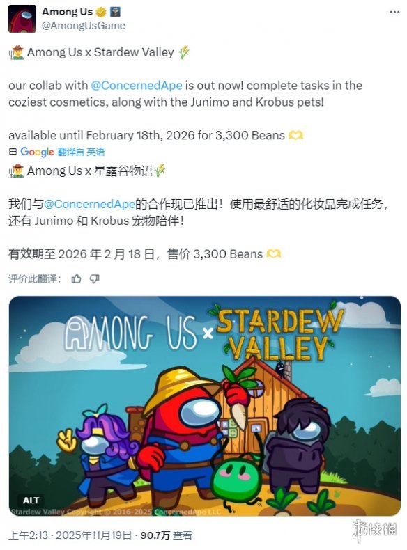 近日,《我们之中(Among Us)》正式开启与《星露谷物语》的联动活动。即日起至2026年2月18日,玩家可在游戏内穿戴《星露谷物语》主题装扮,并通过完成指定任务获取豆子,兑换祝尼魔、科罗布斯等联动宠物。