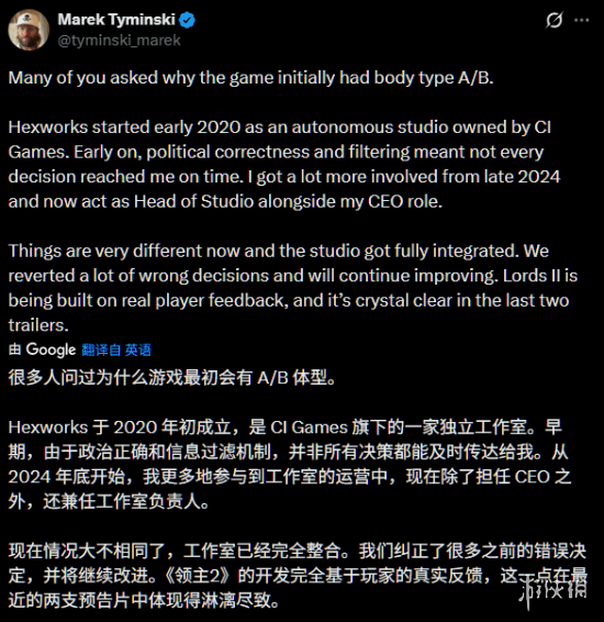 在推文中,Tyminski也回顾了前作《堕落之主》曾因角色设计引发的争议,并解释了当时的决策背景:“很多人问过为什么游戏最初会有‘A/B体型’。Hexworks最初是作为CI Games旗下的一家独立工作室在2020年初成立的,由于政治正确和信息过滤机制,并非所有决策都能及时传达给我。”