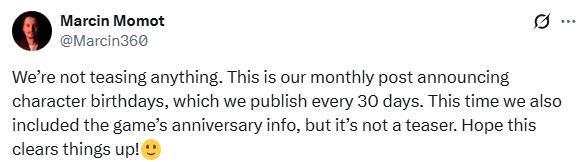 但全球社区总监Marcin Momot随后澄清,该帖子仅为每月例行的角色生日纪念内容,本月额外加入周年信息,属常规操作。历史记录显示,10月及11月确有类似内容发布,官方也未透露周年日将有公告或更新。